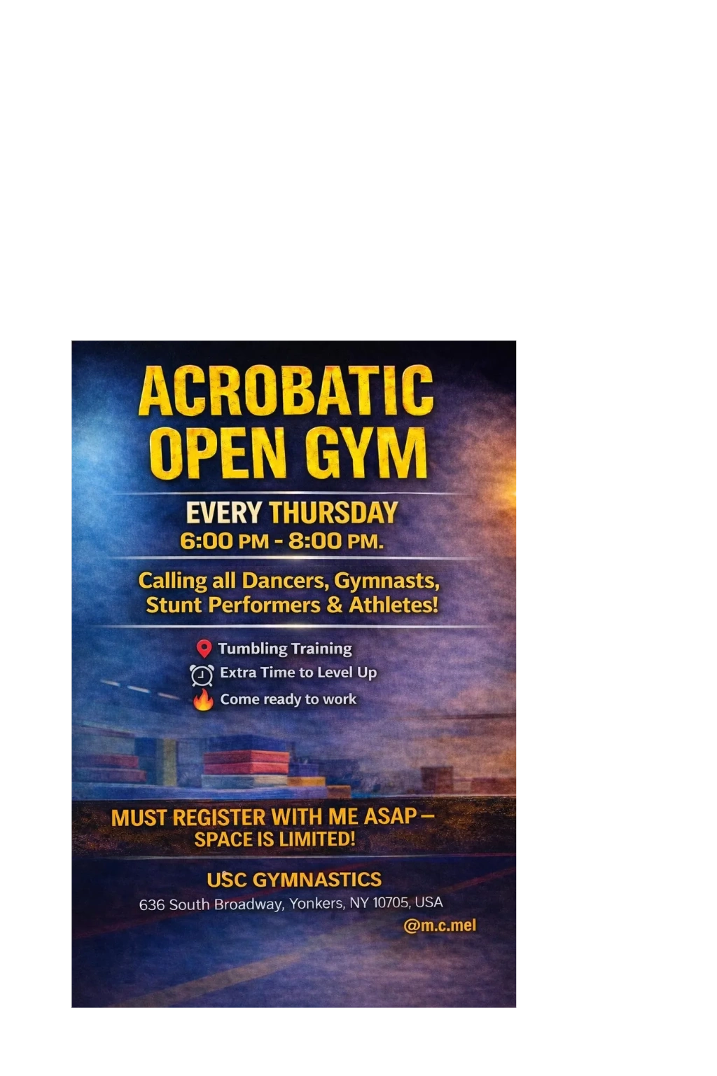 This Open Gym Practice is open to gymnasts, dancers, stunt performers, and athletes!
